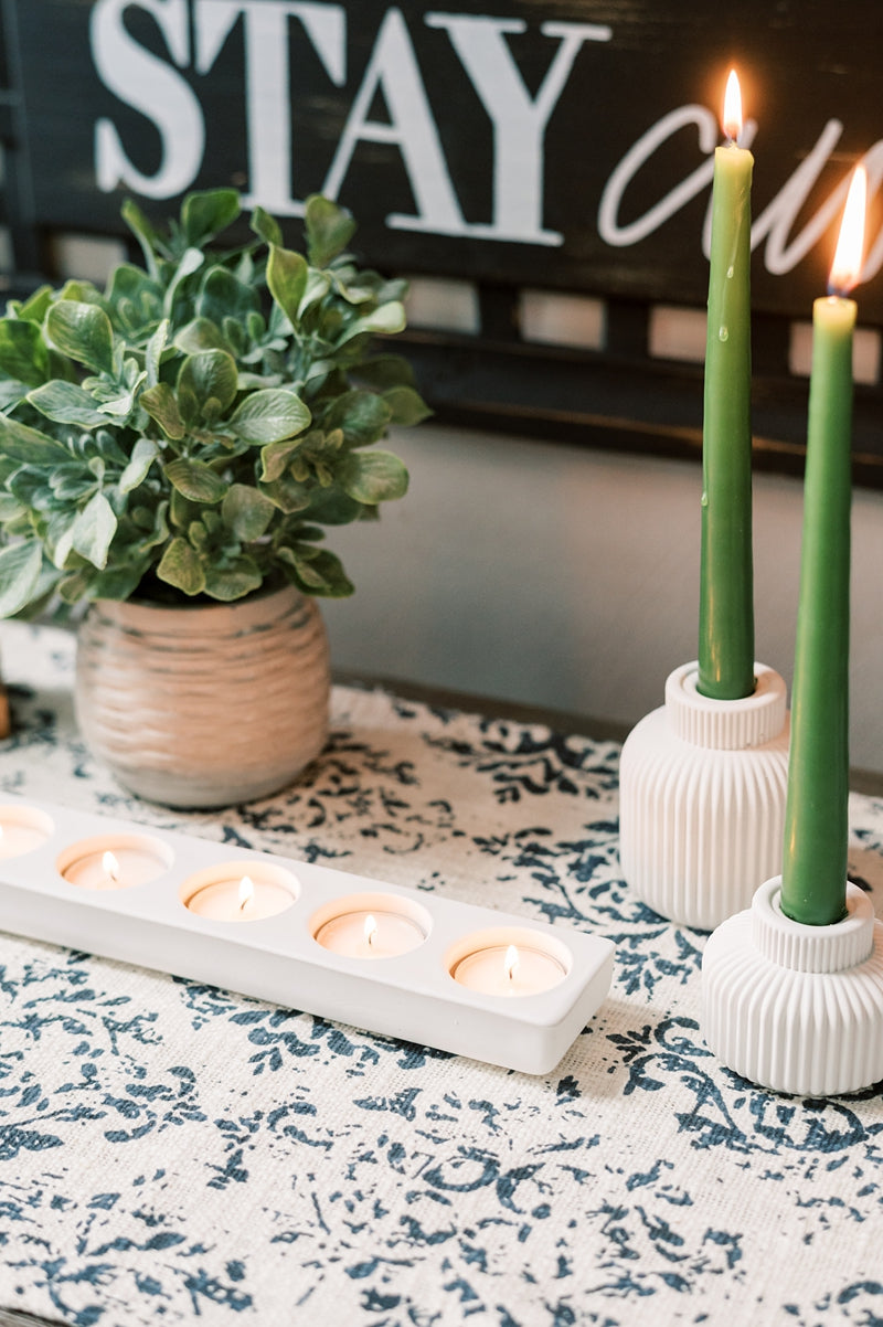 This white concrete tea light holder holds five standard tea lights. Use it on your entry table, dining table or throughout the house to add a clean and modern touch to your decor.